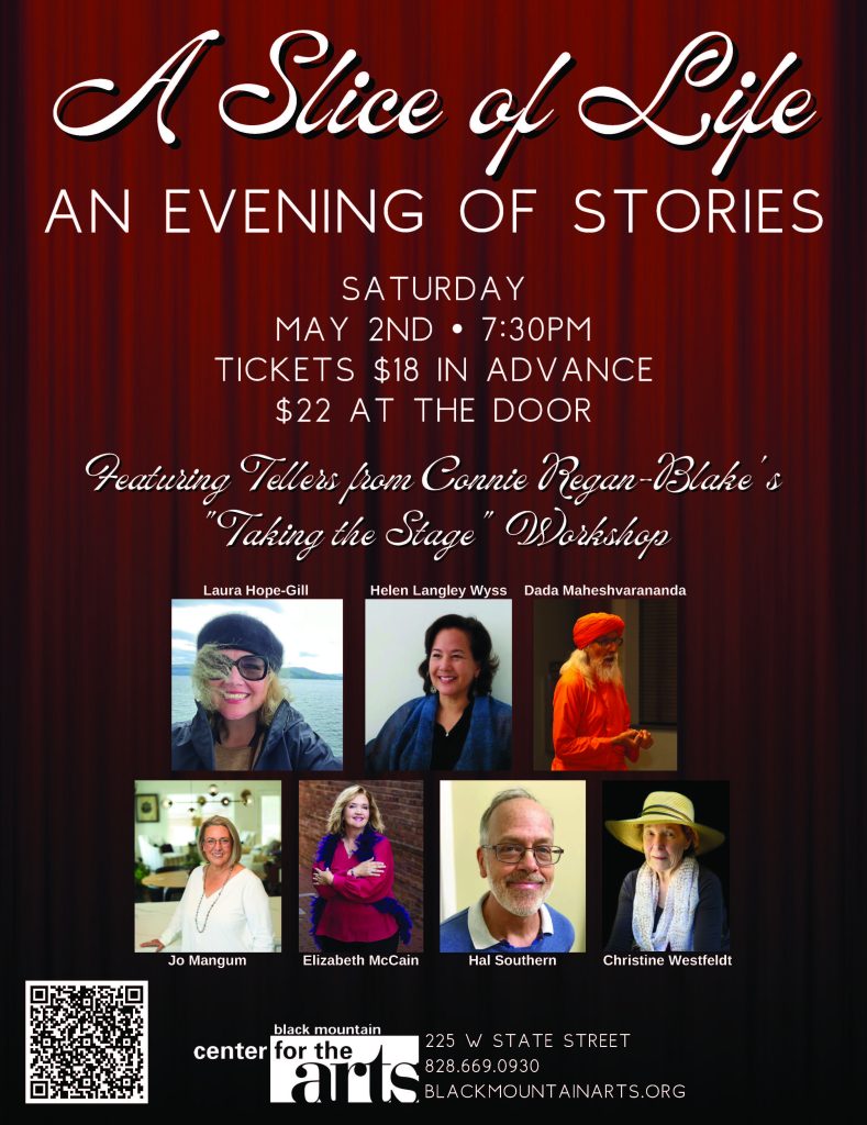 Join Connie as she welcomes her “Taking the Stage” storytelling workshop participants for “A Slice of Life: An Evening of Stories.” This evening of unique voices includes Laura Hope-Gill, Helen Langley Wyss, Dada Maheshvarananda, Jo Mangum, Elizabeth McCain, Hal Southern, and Christine Phillips Westfeldt.
